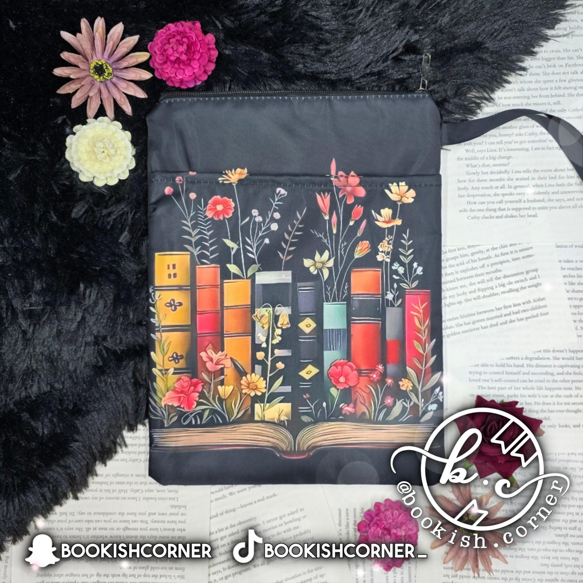 Each of our booksleeves has a zipper on top to secure your book and a pocket in the back for your pens and other bookish items.