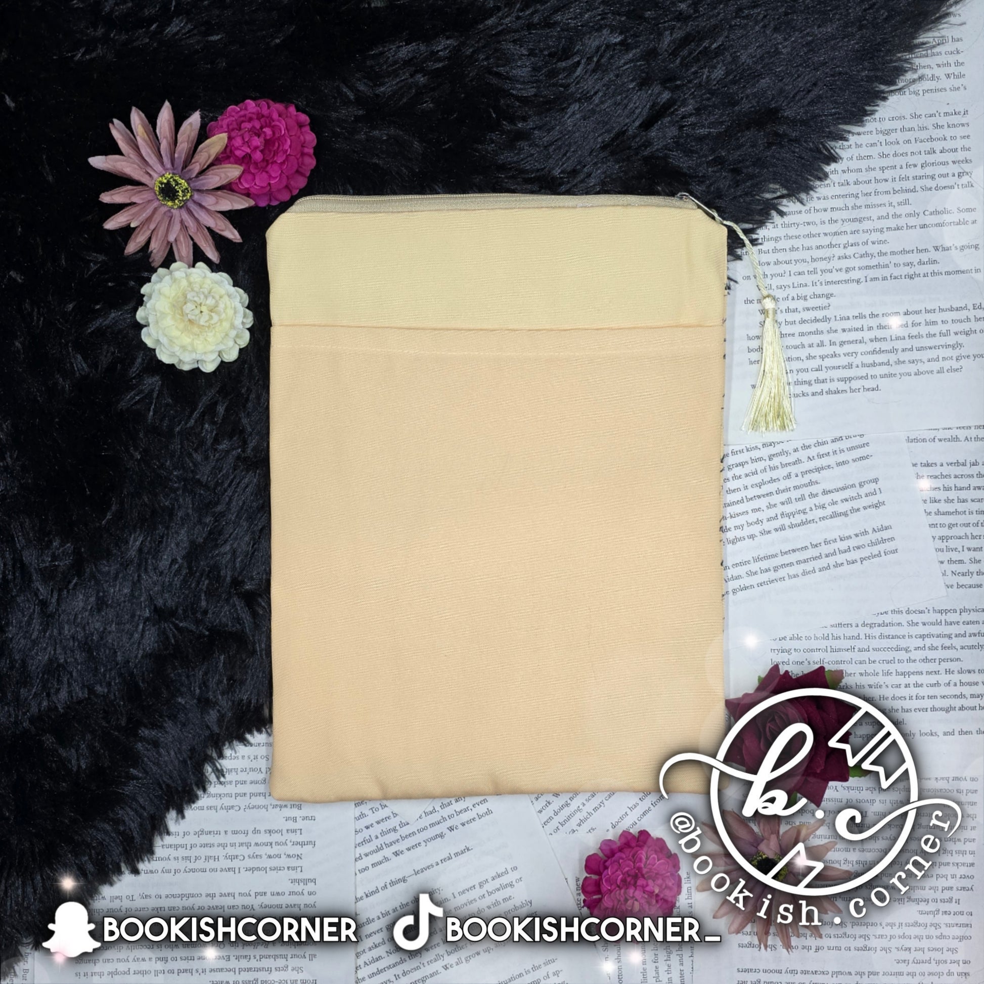 Each of our booksleeves has a zipper on top to secure your book and a pocket in the back for your pens and other bookish items.